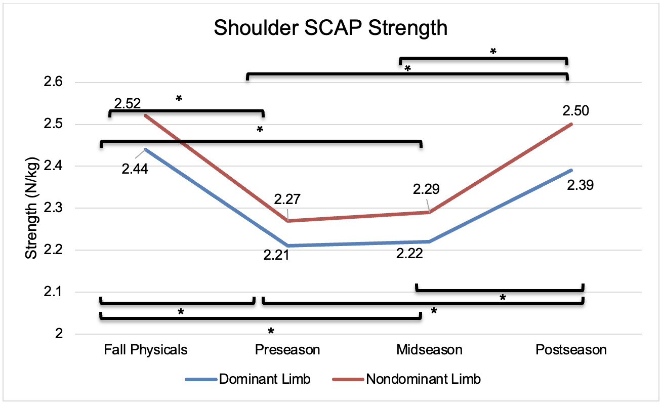 The results of the current study demonstrate changes in shoulder across the course of a season in healthy Division I collegiate baseball players. These findings add value to the existing literature by further detailing the expected changes a participating, uninjured collegiate baseball athlete will experience over time. Significant differences were found between at least one time point for all measures of shoulder strength with the exception of dominant limb IR strength. Dominant and non-dominant limb SCAP demonstrated the largest absolute changes in shoulder strength through a significant decrease in strength during the fall season, and near full recovery of fall physical strength from mid- to postseason. Dominant and non-dominant limb IR decreased over the course of a competitive season, and shoulder ER strength for both limbs demonstrated both significant decreases, followed by increases, throughout a competitive season. There were no significant differences in KJOC scores over the course of a competitive season. These collective results support the hypotheses: there were significant differences in shoulder strength over time, and there was a lack of significant change in KJOC scores throughout a competitive season in this cohort.