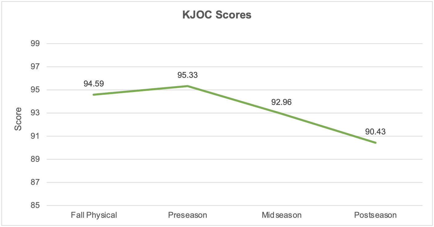 Regarding KJOC scores over the course of a competitive season, male collegiate baseball athletes demonstrated a slight increase of scores from fall physicals to preseason, followed by decreases at mid- and post-season. The mean difference from fall physicals to postseason scores was -4.90 points. These fall in a range of previously reported minimal detectable change scores for different versions of the KJOC utilized in baseball athletes (range 2.42-8.5 points).28–30 Due to a non-significant univariate test for KJOC scores, pairwise comparisons were not conducted.