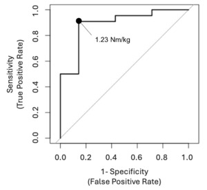 Using the desired outcomes above, we can evaluate the diagnostic nature of “predicting” these outcomes through diagnostic testing. Within sports medicine, the term diagnostic testing is often referenced with “special tests” and their ability to identify the presence of a pathology. As an example, to analyze the diagnostic nature of the Lachman Test to predict an ACL injury,7 the sensitivity and specificity can be calculated though the true-positives, true-negatives, false-positives, and false-negatives. Similarly, the diagnostic nature of a strength threshold can be established by calculating the same values (Figure 1). However, this only assesses the diagnostic accuracy of a single value of quadriceps strength. As quadriceps strength is a continuous variable, with a normative dataset ranging from 0.55 Nm/kg to 3.43 Nm/kg,8 the sensitivity and specificity for every value needs to be evaluated to identify the single value, or threshold, that best predicts our outcome of interest. This analysis can be conducted and illustrated through a Receiver Operator Characteristic (ROC) Curve analysis.9
