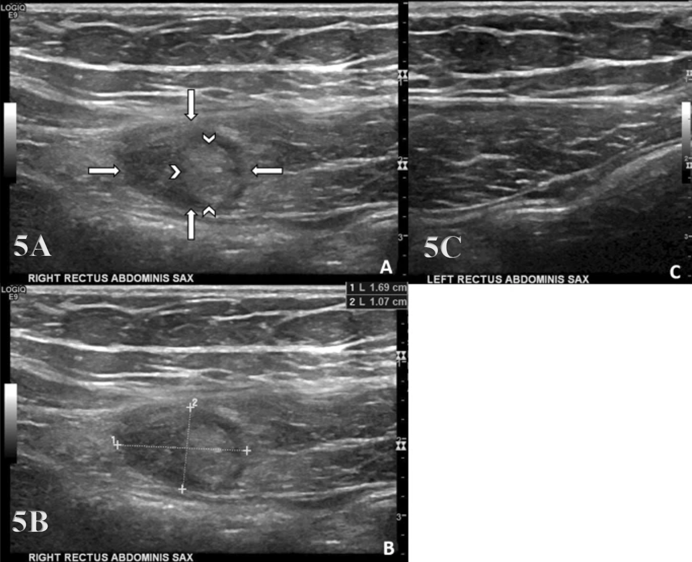 Typically, the transducer will be placed near the proximal portion of the RA perpendicular to the muscle fibers in the SAX. In this position, the transducer can be moved both proximally and distally and can examine the RA in the transverse plane. The cross-section of the RA will be seen as fibular hypoechoic muscle tissue. Additionally, the examiner should be able to easily discern the hyperechoic linea alba and rectus sheath.