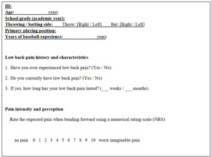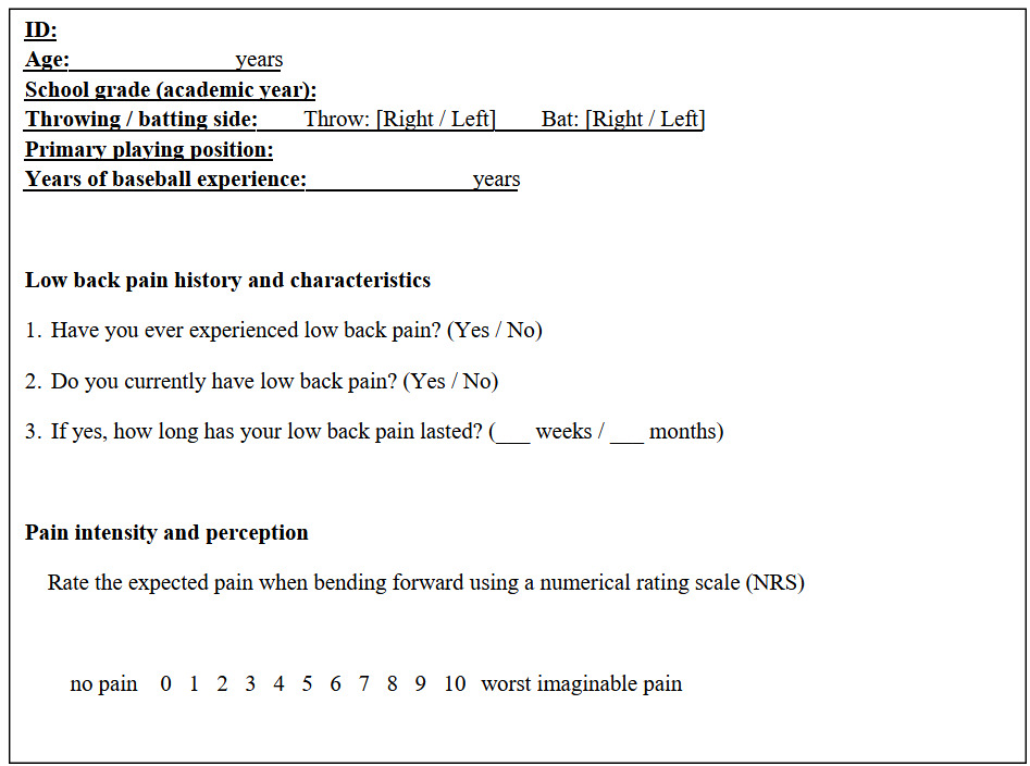 A self-administered questionnaire was used to assess the presence and intensity of LBP and gather baseball-related information. The questionnaire collected information on baseball experience (years) and primary playing positions (pitcher, catcher, infielder, and outfielder).