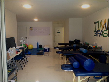 The physiotherapy treatment area in the Olympic Village was approximately 100 m2, with eleven treatment stretchers (Figure 1). Two other bases had a treatment area of approximately 50 m2, with three stretchers each. The departments operated from 8:00 a.m. to 10:00 p.m., a period that could sometimes be extended to accommodate the demands of the athletes. The service area was divided into evaluation rooms and areas for individual treatments. Treatments were performed every day at the physiotherapy department in the Olympic Village, at two other bases, and at the training and competition venues between August 5 and 21, 2016, totaling 17 days of uninterrupted care. Athletes were allowed to receive more than one physiotherapy treatment per day.