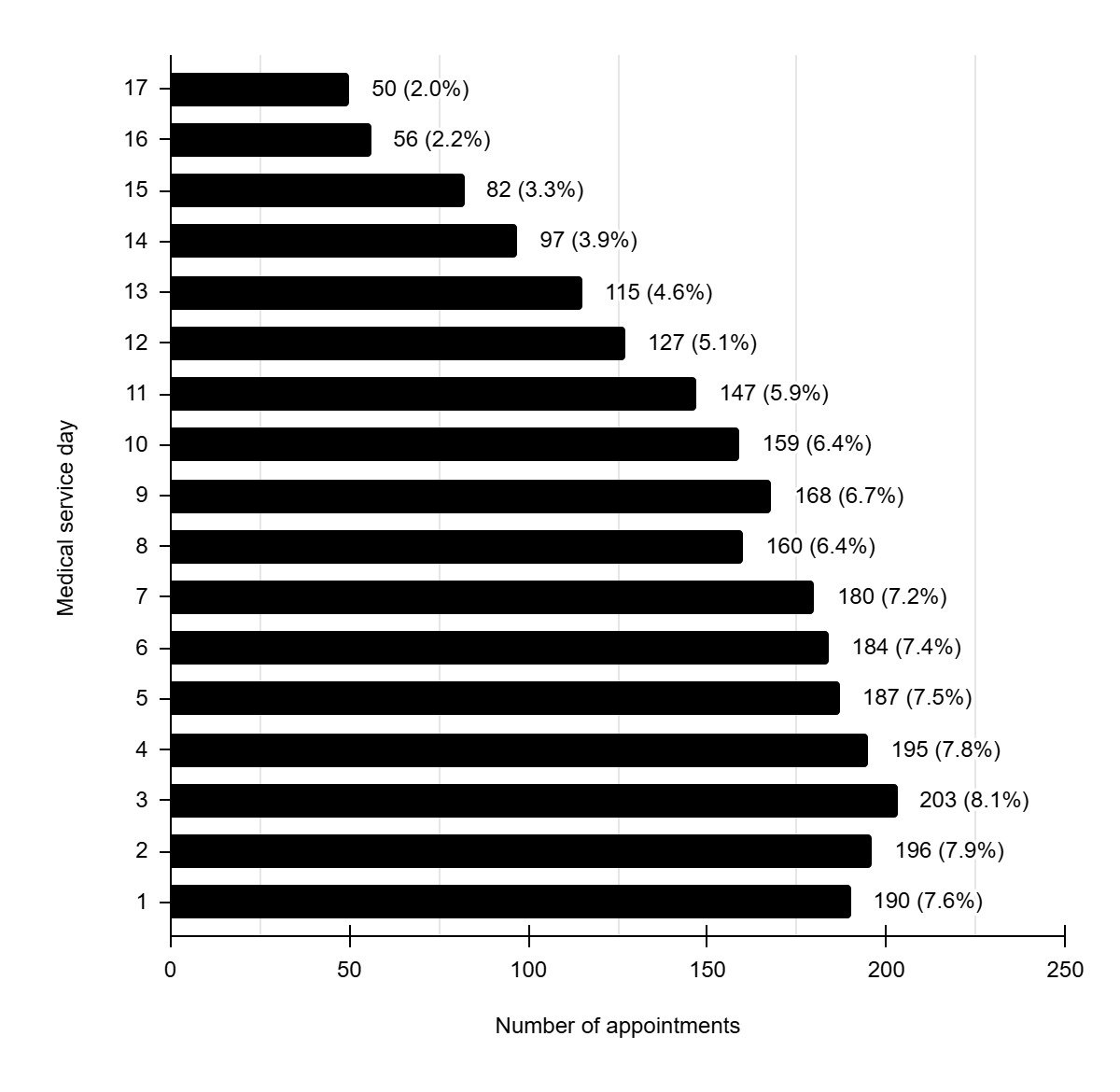 Treatments were carried out every day, between August 5 and 21, 2016, totaling 17 days of uninterrupted service, spanning more than 14 hours a day. The third day of the competition marked the peak in care (203 athletes – 8.1%). During the period in which the Brazilian physiotherapist team was working, 2,496 physiotherapy appointments were recorded, distributed throughout the 17 days of competition. The daily distribution of these services can be seen in Figure 2.
