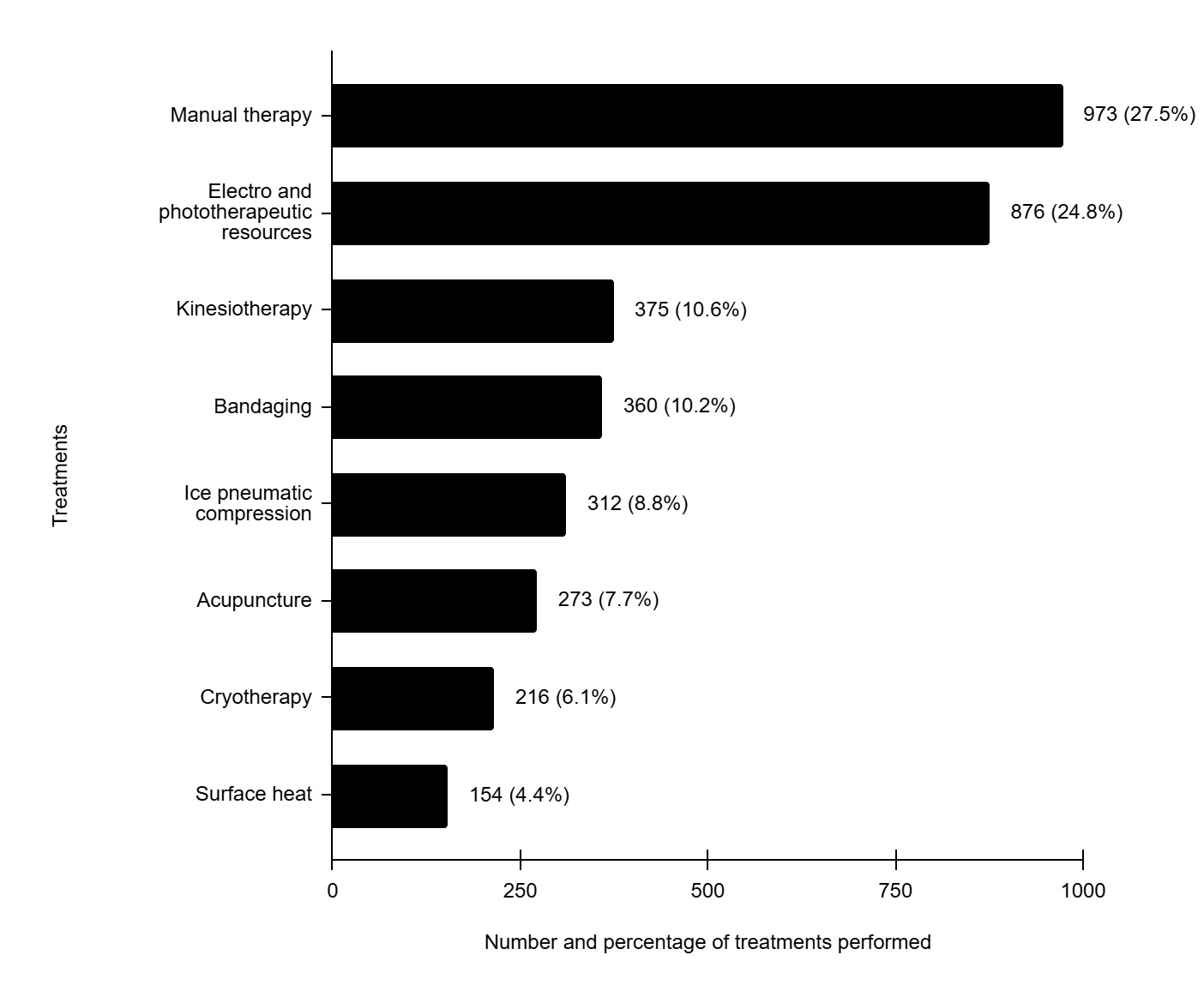 During the period of work of the physiotherapy team of the BOC, the total number of treatment sessions resulted in 3,539 physiotherapy procedures. The distribution of resources used in these procedures is specified in Figure 7. Manual therapy accounted for 27.5% (n=973) of the procedures performed, surpassing any other, followed by the use of electrophysical resources which totaled 24.8% (n=876) of the techniques applied. Other procedures used were kinesiotherapy 10.6% (n=375), bandaging 10.2% (n=360), pneumatic compression with ice 8.8% (n=312), dry needling 7.7% (n=273), cryotherapy 6.1% (n=216), and superficial heat 4.4% (n=154).