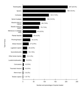 The most frequent types of injuries and the percentage of injury occurrence are presented in Figure 5. The data revealed that tendinopathies were the most common type of injury (n=207; 20.3%), followed by sprains (n=198; 19.4%), contusions (n=120; 11.8%), and spinal myalgias (n=105; 10.3%).