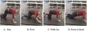 Three licensed physical therapists independently reviewed the video recordings to 1. Verify the number of successful rolls completed; and 2. Classify each participant’s rolling strategy into one of four categories: Hop, Pivot, Walk-up, and Prone to Quad (Figure 1). Consensus was reached through discussion when classifications differed.