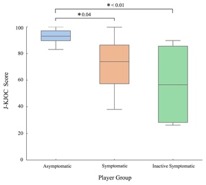 This study had several limitations. First, although the total sample size was sufficient for group comparisons, the low number of symptomatic players (n = 27) may have limited the statistical power of the multivariate regression analyses. To reduce the risk of overfitting, the authors constructed three separate models based on measurement domains, rather than a single model with multiple variables. This strategy aligns with the widely accepted guideline of requiring at least 10 EPV for logistic regression,26 thereby ensuring more robust and interpretable results. Second, because all participants were recruited from a single high school baseball team in Japan, the generalizability of the findings may be limited. Future studies involving multisite recruitment and broader sampling are necessary to validate the applicability of the J-KJOC cutoff score across different populations. Third, the ISP group (n = 4) was small and represented only a few severe cases. Therefore, the findings related to this group should be interpreted with caution and regarded as preliminary.