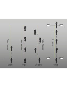 Perhaps no functional tests have been more commonly employed as ACL RTP tests than the single leg hop tests. Single leg hop tests have been demonstrated to be reliable and valid,40–42 and have been shown to predict injury risk. The most reported hop tests are the single leg hop for distance, the triple hop, the crossover hop, and the timed hop. In brief, the single leg hop for distance is a single hop in which the maximum distance covered is measured. The triple hop is similar, but consists of three hops for maximum distance, all on the same leg. The crossover hop requires three hops, but each jump must land on alternate sides of the designated line. Finally, the timed hop test measures the amount of time it takes the participant to hop six meters on a single leg, regardless the number of jumps needed (Figure 8 ).41