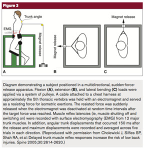 Trunk strength and stability have proven more difficult to assess. In general, efforts to measure the strength and stability of the trunk are variable across different studies and in many cases require complex testing devices. Moreover, there is no agreed upon measure of trunk muscle strength or stability. Zazulak et al. studied trunk stability using a sudden “force release” device (Figure 5).15