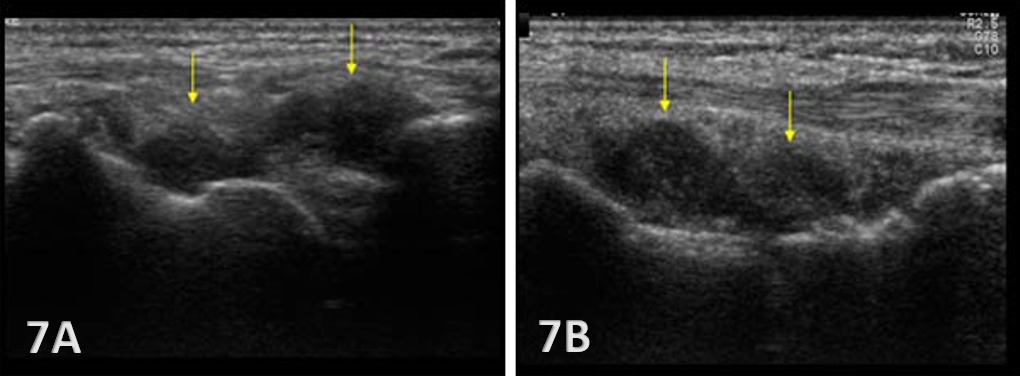 Hypoechoic bands of synovial tissue folds are present.