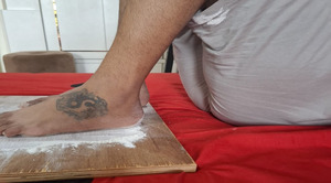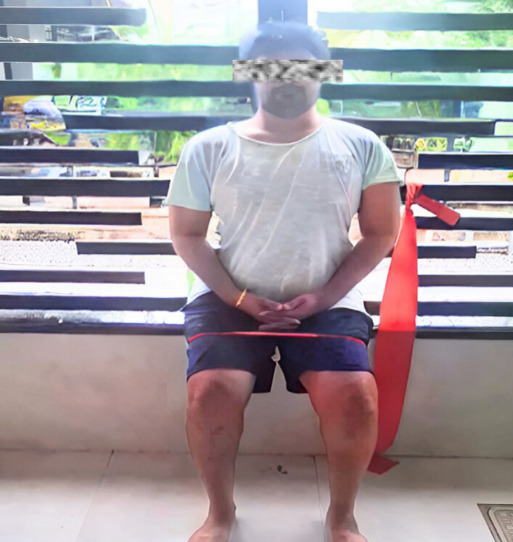 The subject progressed steadily through Phase 1 (Weeks 1–4) and Phase 2 (Weeks 4–8). These phases included wall-assisted flexion, prone hangs, patellar mobilization, active heel slides, towel-assisted knee flexion, and SLR variations in multiple positions. In the early rehabilitation phase, a modified wooden board-assisted knee flexion exercise was used to re-educate the range of motion (Figure 3). He was able to perform partial weight-bearing gait training and early hip-strengthening drills using resistance bands. The subject achieved full weight-bearing walking with a brace and reached 130° knee flexion by the end of Phase 2.