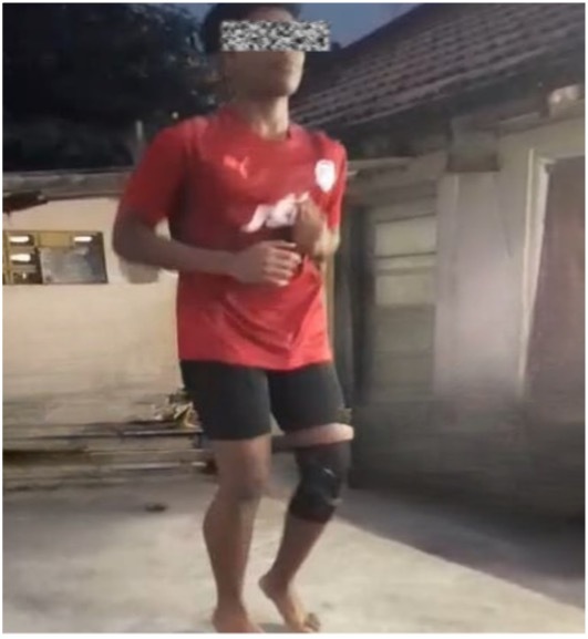 A new rehabilitation strategy was initiated when this subject began therapy with the authors, focusing first on regaining isolated strength and neuromuscular control. Strength exercises included machine-based leg press, hamstring curls (progressed from isometric to eccentric), Spanish squats, step-ups with increasing resistance and height, Romanian deadlifts, single-leg wall sits, and balance board drills.Upon resumption of therapy, the patient progressed through foundational motor tasks, including jogging in place (Figure 5), to reintroduce neuromotor demand under controlled conditions. Given the patient’s age, recovery potential, and demonstrated engagement with rehabilitation, gradual progression to gym-based resistance training was initiated under close supervision.