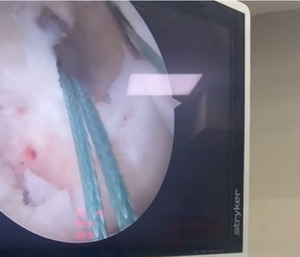 Case-1, a 36-year-old recreational badminton player and private business owner, sustained a non-contact ACL injury on his left knee approximately 10 weeks prior to surgery. The surgical reconstruction utilized a patellar tendon graft, confirmed by intraoperative imaging with the final arthroscopic suture fixation visualized clearly (Figure 1) (Figure 2). The subject was right-leg dominant with no associated injuries. The subject had a prior history of low-level gym training, mostly cardio-focused, and had consistently avoided weight training due to repeated physical discomfort after lifting — including fever, muscle soreness, and nausea-like sensations. This history became a significant barrier during the strength-building phases of rehabilitation.