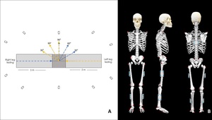 Following instrumentation, twenty-six reflective markers were attached to bony prominences on both sides including the anterior and posterior superior iliac spines, iliac crest, greater trochanter, medial and lateral femoral epicondyles, medial and lateral malleoli, distal heads of the first and fifth metatarsals, proximal head of the fifth metatarsal, and the heel. In addition, five rigid clusters (four markers each) were positioned on the lateral thighs, lateral shanks, and trunk (Figure 1B). Marker placement followed the Calibrated Anatomical Systems Technique (CAST), a standard method used to identify anatomical landmarks and track segment motion.20