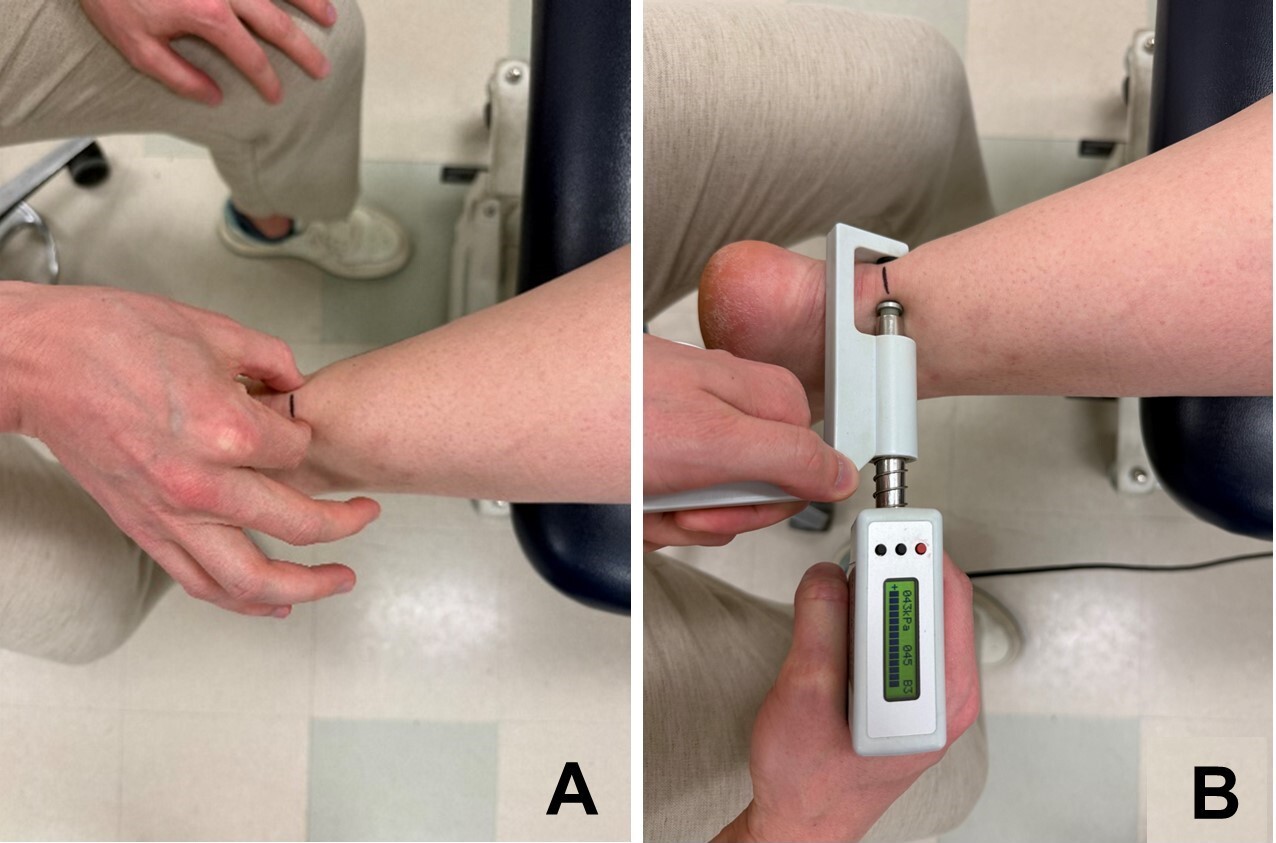 Pain on palpation was performed by squeezing the medial and lateral aspects of the midportion of the Achilles tendon between the thumb and index finger (Figure 1a). Participants reported their pain on palpation utilizing the Numeric Pain Rating Scale (NPRS), where 0 indicates no pain and 10 indicates worst pain imaginable, and the pain intensity was used for analysis.19 PPT (Figure 1b) was performed at the location of maximal pain on palpation using a mechanical algometer (SBMedic, Solna, Sweden). Pressure was applied simultaneously to the medial and lateral sides of the tendon over a contact area of 1cm2 at a rate of 30kPa/s. Participants were instructed to press a response button the first moment that the pressure sensation became painful; the pressure reading at this moment was then recorded. An average of three trials for the PPT was utilized for analysis.