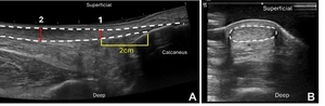The detailed methods utilized to assess the following tendon structure variables have been previously described.20 Ultrasound imaging (GE LOGIQ e; GE Healthcare, Chicago, Illinois) was performed using the B-mode ultrasound and a 5cm linear array transducer set to a frequency of 10Hz and a depth of 3.5cm. Achilles tendon thickness (mm) was assessed as the area of maximal anterior to posterior tendon thickness per visualization upon ultrasound imaging. The degree of Achilles tendon thickening (mm) is a measure of Achilles tendon pathology.6 This was assessed by subtracting the thickness of healthy Achilles tendon at 2cm (or an adjusted location if thickening was present at 2cm) from the maximal tendon thickening (Figure 2a). Achilles tendon cross-sectional area (CSA, mm2) was measured with the ultrasound probe in short axis using a gel-standoff pad to increase visibility of the Achilles tendon (Figure 2b). CSA was measured at the marked location for maximal tendon thickness. Images were exported and measured (Osirix Dicom Viewer; Pixmeo SAL, Bernex, Switzerland) and the mean of three images was used for analysis.