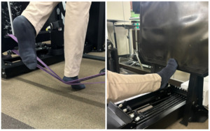 It is common for the patient to have developed compensatory patterns after months of pain and trialed conservative treatment; therefore, it is essential to focus on correcting compensatory patterns at this stage. This is addressed early with exercise to target foot intrinsics and arch doming. This is a critical skill when aiming to limit compensatory patterns in gait when transitioning from a walking boot to a shoe. Early recruitment of the gastroc-soleus complex with low-load plantarflexion-based exercises, such as band resisted plantarflexion or seated heel raises, is essential during this phase of rehabilitation to establish satisfactory muscular activation patterns. Early use of Neuromuscular Electrical Stimulation (NMES) with exercise can assist in establishing proper neuromuscular patterning and avoidance of compensatory patterns from deep posterior and lateral compartment musculature. Recommended postoperative NMES parameters for the calf mirror those used for quadriceps activation after knee surgery: 30–50 Hz frequency, 250–400 µs pulse duration, maximum tolerable intensity producing a visible contraction, and a 1:1–1:2 duty cycle (10 s on, 10–20 s off).32,33 Blood flow restriction (BFR) training may also be used two to three times per week to augment early exercise and challenge the gastroc-soleus complex without requiring a heavy external load that would be contraindicated at this stage of rehab. Recommended parameters include cuff placement proximal to the calf, an occlusion pressure of ~60-80% of limb occlusion pressure, low external load, and four sets per exercise with repetitions ranging from 15-30 reps per set with rest intervals of 30-60 seconds.34 Both with exercise and with functional activities, it is important to avoid extreme dorsiflexion ranges during this phase as to allow for appropriate healing.