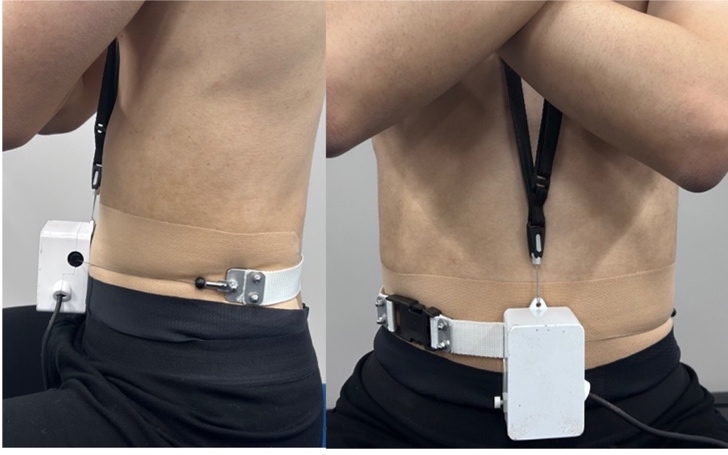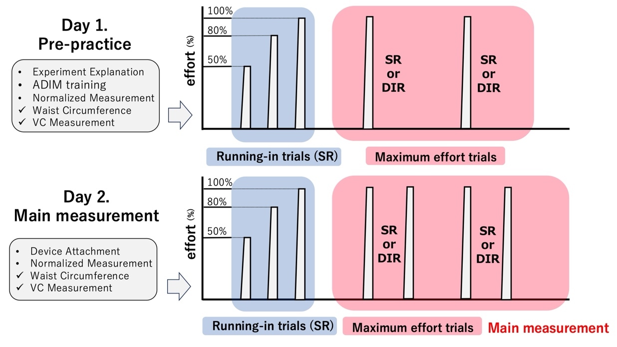 The study was conducted over two sessions: a familiarization day (Day 1) and the main measurement day (Day 2). Familiarization was undertaken to minimize learning effects during the main trials.22 On Day 1, following explanation and obtaining consent, data concerning the participants’ height, body mass, body fat, and BMI were obtained, and patch testing was conducted. DIR was practiced for approximately five minutes, followed by measurement of the baseline waist and VC for normalization. The participants then performed three submaximal practice trials at 50%, 80%, and 100% effort, with ≥1-minute rest between trials. Subsequently, each condition was performed once at maximal effort, with ≥2-minute rest intervals.