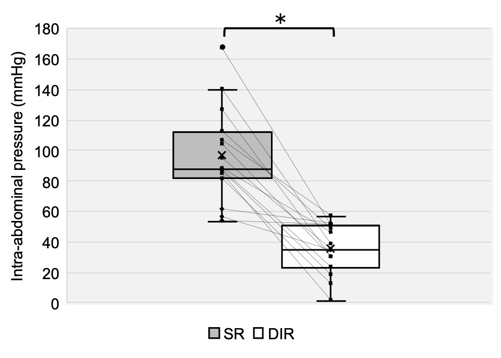 IAP was measured using a sterilized catheter-type pressure sensor (MPR-500, Millar Instruments, USA). Rectal pressure, measured approximately 15 cm from the anus, was used as an index of IAP.2 The sensor was immersed in physiological saline for 30 minutes before measurement and treated to prevent drift. A rubber cover (NIKKISO-THERM, Tokyo, Japan) with a small perforation was applied to the sensor,18,23 and it was secured using surgical tape (Micropore™ Skin Tone Surgical Tape, 3M NIKKISO-THERM, Tokyo, Japan). To reduce discomfort during insertion, a topical anesthetic (2% Xylocaine Jelly, Aspen Japan, Tokyo, Japan) was applied after confirming the absence of adverse reactions using a skin patch test, in which a small amount of the anesthetic was applied to the inner aspect of the upper arm.