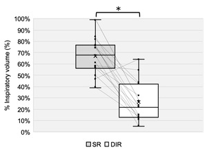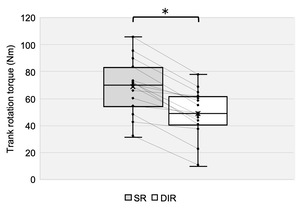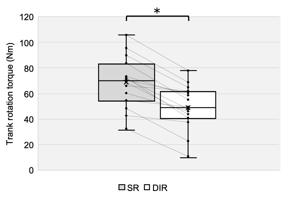 IAP was significantly greater in the SR condition than in the DIR condition, with a large effect size (p < 0.01, d = 2.48; Table 1, Figure 5). Torque was also significantly greater in the SR condition than in the DIR condition, with a large effect size (p < 0.01, d = 1.03; Table 1, Figure 6). Similarly, %inspiratory volume was significantly greater in the SR condition than in the DIR condition, with a large effect size (p < 0.01, d = 2.41; Table 1, Figure 7). Finally, %waist was significantly greater in the SR condition than in the DIR condition (p < 0.01, r = -0.88; Table 1).