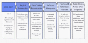Rehabilitation following a knee arthroscopic irrigation focuses on restoring joint function, managing inflammation and gradually returning to activity. Rehabilitation followed a 3-phase, criteria-based progression: (1) acute phase, (2) progressive strengthening and power, and (3) plyometrics and return-to-running phase. The interventions utilized in this case were guided by the knee ligament sprain CPG for knee instability and movement coordination impairments and were selected to align with the biomechanical roles of the reconstructed ligaments. The subject in this case underwent arthroscopic irrigation approximately six months after the primary PLC reconstruction with lateral meniscus repair, and eight weeks following an ACL and PCL reconstruction. The protocol emphasized restoring strength and resolving residual ROM impairments between weeks 8–12 in preparation for plyometrics. In cases of septic arthritis, early and structured rehab is crucial due to risks of stiffness, arthritic changes and poor functional outcomes.26,27