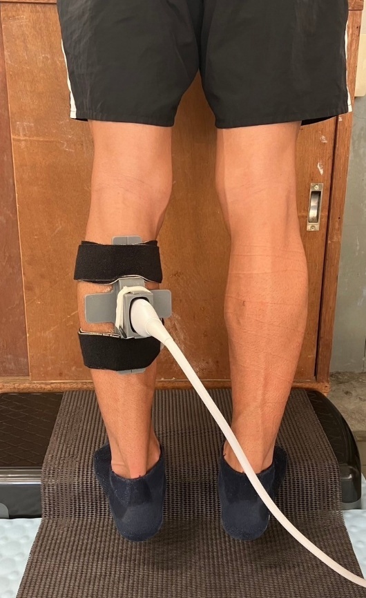 The posterior lower leg was imaged using an ultrasound device (SONIMAGE MX1α, KONICA MINOLTA Inc., Tokyo, Japan) with a high-sensitivity linear probe (L11-3, KONICA MINOLTA Inc., Tokyo, Japan). The probe was positioned longitudinally, parallel to the muscle fibers, at the proximal one-third of the distance between the popliteal fossa and the medial malleolus, marked at the medial gastrocnemius muscle belly.19 The sampling frequency was set at 30 Hz. To prevent probe movement during measurement, a custom-made fixation device was designed using computer-aided design (CAD) software (Rhino 7, Robert McNeel & Associates, Seattle, WA, USA) and fabricated with a 3D printer (Form 2, Formlabs Inc., Somerville, MA, USA). The device was secured to the lower leg with a band (Figure 3). The reliability of this fixation method was previously confirmed in dynamic lumbar imaging, demonstrating high intra-class correlation coefficients (ICC: 0.83–0.94).9 During measurement, participants stood on a step with both heels extending beyond the edge and performed rhythmic heel-lowering and heel-raising movements in time with a digital metronome set at 60 bpm. Similar to the fascial flossing intervention, each repetition consisted of a one-second eccentric descent phase, a two -second concentric ascent phase, and a brief rest period afterward, with each set lasting a total of three seconds. After familiarization, three trials were recorded for analysis.