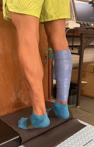 One leg was randomly assigned using a random number table to receive the fascial flossing intervention, while the other leg served as the control. Fascial flossing was performed using a natural rubber floss band (COMPREFloss™, 5.1 cm×3.5 m; Sanctband Japan Co., Tokyo, Japan). A Kikuhime pressure sensor (Kikuhime®, TT Meditrade, Horsens, Denmark) was placed beneath the band to monitor compression, which was maintained at approximately 156.9 ± 10.0 mmHg.16 The band was wrapped from the proximal to distal portion of the lower leg with about 50% overlap to ensure uniform pressure. While the band was applied, participants stood on a step with their heels extending off the edge and performed bilateral heel raises in sync with a digital metronome set at 60 beats per minute (ME-150, Yamaha Corp., Hamamatsu, Japan). Each repetition consisted of a one-second eccentric lowering phase and a two-second concentric lifting phase, totaling three seconds per repetition, with 10 repetitions performed. This exercise was performed simultaneously with both legs, but only the intervention leg received compression (Figure 2). After heel raises, participants performed a one-minute passive exercise while seated, rotating the flossed calf inward and outward, while the control leg remained at rest. Immediately following this, the same bilateral heel raise protocol was repeated for another 10 repetitions. The band was then removed, and both legs performed one minute of walking to restore circulation and ensure safety.
