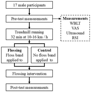 A within-subject design was used, with each participant serving as their own control by applying the fascial flossing intervention to one leg while the contralateral leg received no intervention. This approach minimized inter-individual variability and increased statistical power. The independent variable was the condition (flossing vs. control), while the dependent variables were selected to capture key aspects of recovery. These included ankle dorsiflexion range of motion (ROM) measured by the Weight-Bearing Lunge Test (WBLT) to assess flexibility, perceived muscle tightness evaluated by a Visual Analog Scale (VAS), Reactive Strength Index (RSI) as a performance indicator, and myofascial gliding assessed by ultrasound imaging to directly quantify fascial and muscle tissue movement. These outcome measures were chosen based on previous literature linking them to muscle recovery, functional performance, and overuse injury risk in distance runners. The treadmill running protocol was implemented to induce a standardized level of fatigue, ensuring consistent pre-intervention conditions for all participants.
