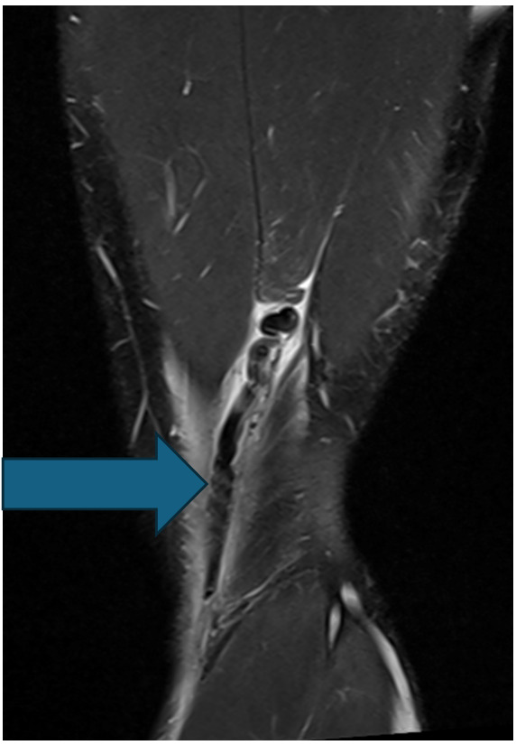 The subject was a 20-year-old male who was actively competing in collegiate American football within the Football Bowl Subdivision – the highest level of collegiate football in the United States. The subject originally sustained an injury to his distal posterior thigh on his nondominant left leg when performing resisted sprinting with a parachute attachment. While decelerating, the athlete slipped during the initial contact phase of his running gait, causing his knee to hyperextend and resulted in immediate posterior thigh pain. The athlete attempted to continue training during the session, however, ultimately discontinued participation due to high levels of pain at the distal posterior thigh. Upon evaluation by the athletic trainer, the athlete presented with pain upon resisted knee flexion and with a palpable defect at the posterior distal thigh. The athlete received an MRI shortly after the injury. The MRI revealed an avulsion of the distal semitendinosus tendon with 4 cm of cranial retraction (Figure 1). After all treatment options were discussed with the athlete and he was presented information regarding the high failure rates of conservative care and evidence of conservative cases with large variability in return to sport time, the athlete chose to proceed with the left distal semitendinosus tendon excision procedure for an expedited return to sport.
