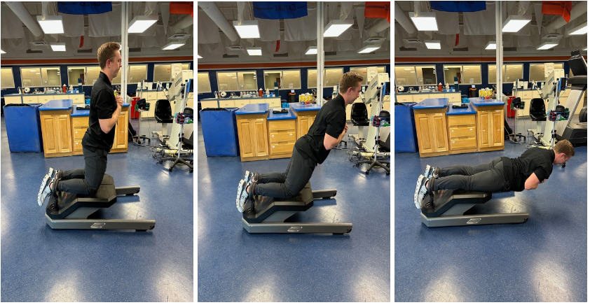 Closed kinetic chain (CKC) movement variations using blood flow restriction (BFR) were introduced to progressively load the lower limb and to induce metabolic stress to local tissue. BFR facilitates muscular hypertrophy adaptations due to metabolite build-up caused by the hypoxic environment induced in tissues with low thresholds for mechanical stress.39 Exercises included: leg press, mini-squats, leg curl, calf raises, and lateral heel taps. The subject performed the recommended rep scheme of 30/15/15/15 with a 45-second rest between sets, with the cuff placed proximally on the subjects upper thigh and continuously inflated at 80% of occlusion. The Delfi Personalized Tourniquet System was used for BFR training in this case. The Delfi device uses sensors within an inflated pneumatic cuff to continuously measure patient blood pressure and to calibrate the limb occlusion pressure needed to restrict arterial blood flow at a percentage set by the therapist for the desired training stimulus while the patient performs exercises.40 The total time in the tourniquet did not exceed >10 minutes in any single session.41 CKC hip-hinge and hip bridge variations were also introduced to progress mechanical stress to the hamstrings, external resistance was gradually increased as tolerated while not causing the patient to exceed the recommend pain threshold of 4/10.38 To progress to the next phase the subject had to demonstrate symmetrical knee extension and flexion range of motion compared to the contralateral limb, pain-free ambulation, and <4/10 pain with previously prescribed exercises. Additionally, at this time point, the subject began strength training of the contralateral limb and upper body in the weightroom with the performance staff to minimize any deconditioning effects once the athlete discharged crutches and met the previously described Phase II exit criteria.