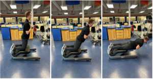 The subsequent phase of rehabilitation built upon elements of the previous phase. The knee immobilizer and crutches were discharged as the incisions closed, the subject demonstrated adequate muscle activation and movement coordination with gait, and pain levels diminished with walking. Restoring full range of motion at the knee continued to be a primary focus with the goals of maintaining full, symmetrical knee extension and establishing knee flexion within 95% (120-degrees) of the contralateral side (125-degrees). Heel slides were still present in the rehab program; however, once the subject achieved 100 degrees of active assisted flexion, the recumbent bike was utilized to facilitate knee flexion and served as an entry point to aerobic energy system training.