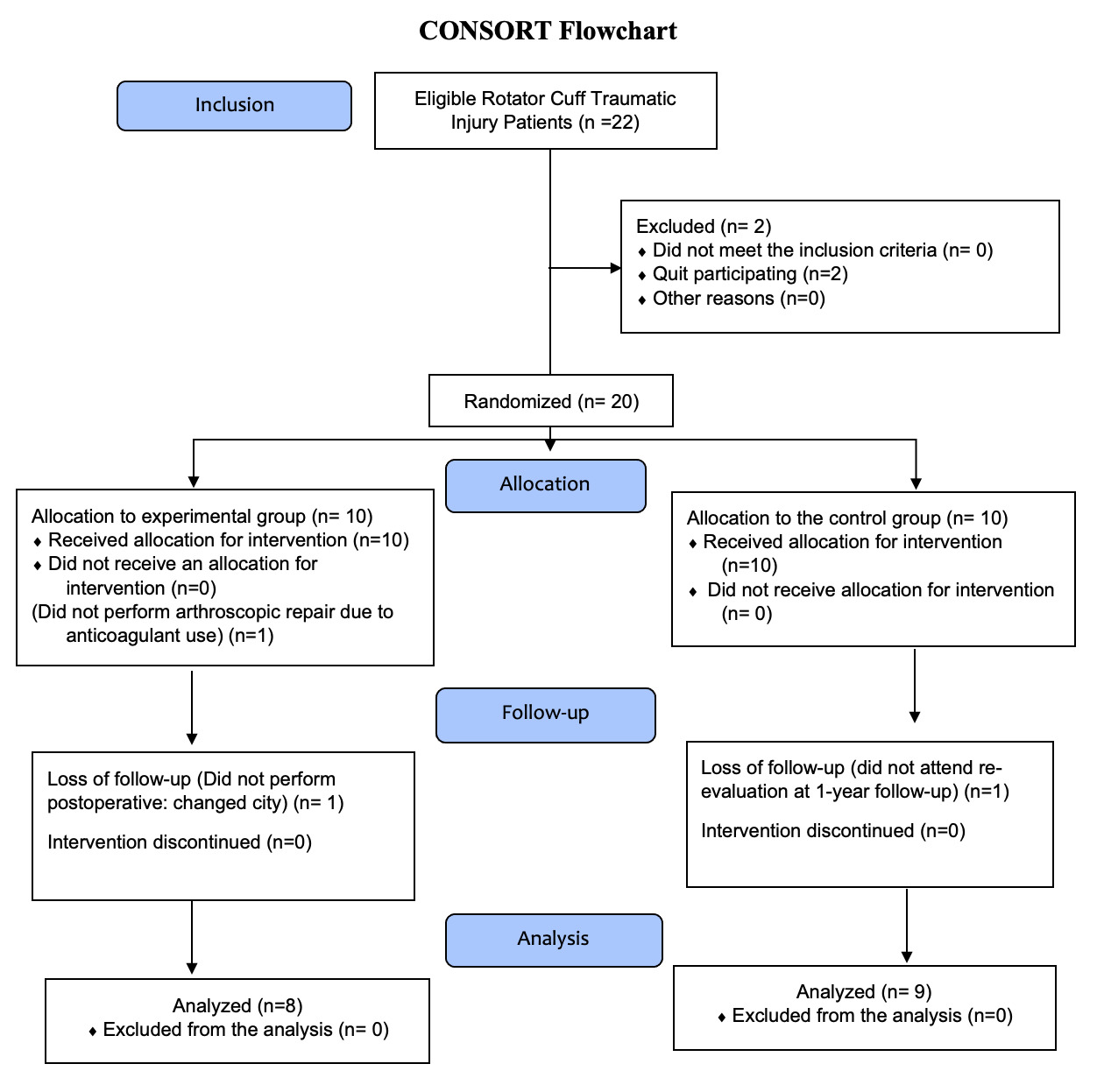 The post-operative rehabilitation protocol (Appendix 2) was the same for both groups and began one week after surgery. All individuals were reassessed in the third month and in the one-year post-operative follow-up, using the VAS, ROM, the Disabilities of the Arm, Shoulder and Hand Questionnaire (DASH), the Western Ontario Rotator Cuff Index (WORC), and 12-item health survey (SF-12). This study was conducted in accordance with the CONSORT guidelines for clinical trials.