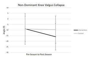 There was a main effect of time for dominant knee valgus collapse (p<0.01), but changes in dominant knee valgus collapse did not exceed the SDC for either group. There was a main effect of time for non-dominant knee valgus collapse (p=0.03). Non-dominant knee valgus collapse decreased from preseason to postseason, but only exceeded the SDC in the intervention group (Figure 2).