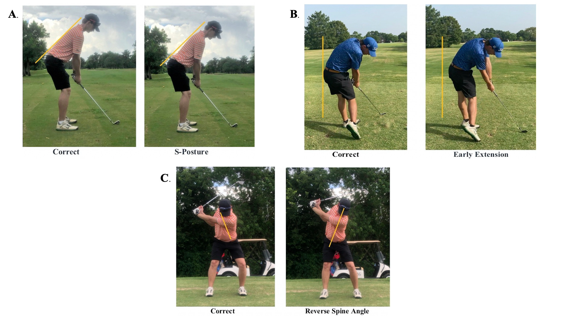 The staff of the Titleist Performance Institute (TPI) has vast experience working with golfers of all ages and handicaps and is a leading resource when it comes to golf fitness, rehabilitation, and instruction. They have developed a screening tool to help golfers raise body awareness in regard to their fitness capabilities as well as identifying golf swing characteristics that are more commonly associated with pain and dysfunction. They utilize a philosophy called the Body-Swing connection, which consists of identifying swing characteristics that are likely present based on the results from their golf specific movement screen.4 During the swing evaluation, there are twelve characteristics which the golfer is being assessed. Since the movement screen has already identified which swing characteristics are more likely to be present, it is important to pay careful attention to these specifically. Reverse spine angle (RSA), early extension, and S-posture are all found to influence the lower back during the golf swing and are likely related to an injury occurring in this region related to the number of repetitions.3,4 Depiction of each of these swing characteristics can be found in Figure 1. Several other identified factors help determine who is more likely to sustain a low back injury from playing golf. The highest predictor for LBP is having a BMI < 25.7 kg/m.2,5 This suggests that the tall, slender golfer is actually at a higher risk than someone with greater mass relative to their height. The second known predictor is having a right-side deficit (in right-handed golfers) of >12.5 seconds on the side-plank endurance test compared to the left.5