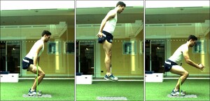 Stage 3 transitions to a greater use of unilateral plyometrics and is performed in conjunction with a multi-directional on-field coordination program (pre-planned coordination tasks). It transitions from forward and vertical unilateral plyometric to lateral and then multidirectional unilateral plyometric tasks. The key aim by the end of the stage is to have good kinematics during high speed change of direction and good single leg drop jump and hop performance (multiplanar). Ideally movement quality would be confirmed using qualitative analysis of sagittal and frontal plane kinematics, using high speed (e.g., 240Hz) camera systems.9,66 Unilateral plyometrics play a key role in supporting movement progressions and unilateral control, whilst bilateral plyometrics are used to support enhancements in neuromuscular function (strength, power and RFD) in this stage. Key aspects of the unilateral exercises are to support enhanced motor control with gradually reducing GCT to mimic sport-type tasks (e.g., progressing from 1-2 s GCT to 0.25-0.4 s GCT). Example tasks can be seen in figures 11 to 14 and within Table 2.
