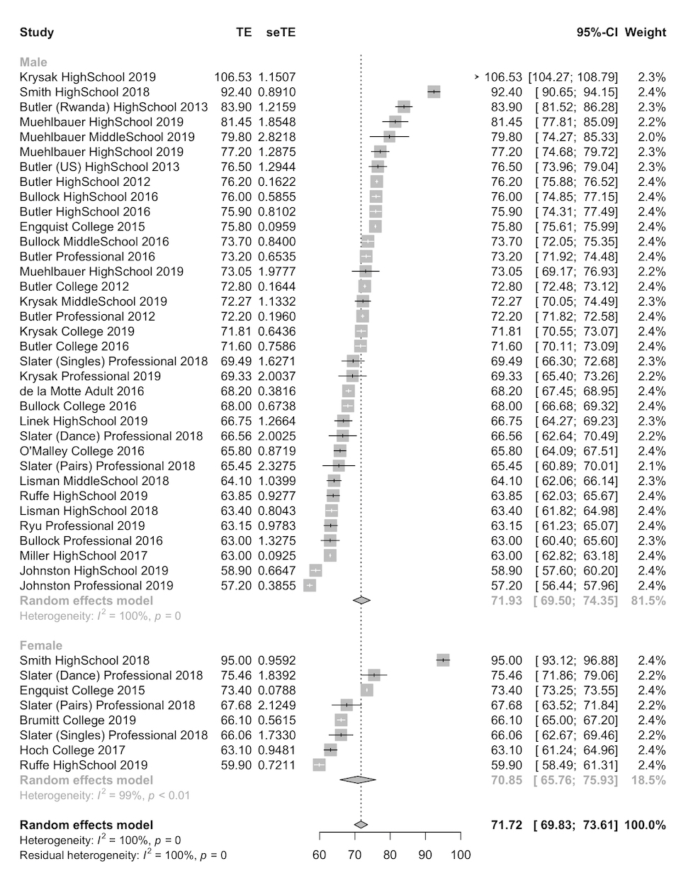 When sex was considered alone, differences were observed in the posteromedial direction (Male: 109.6 95% CI 107.4-111.8; Female: 102.3 95% CI 97.2-107.4; p < 0.01) and posterolateral direction (Male: 107.0 95% CI 105.0-109.1; Female: 102.0 95% CI 97.8-106.2; p=0.036).12–14,25,27,37,43,44,58–61,63–66 However, no difference was observed between sexes in the anterior reach direction (Male: 71.9 95% CI 69.5-74.5; Female: 70.8 95% CI 65.7-75.9; p=0.708)12–14,25,27,37,44,54,57–61,63,65–67 or in composite score (Male: 95.8 95% CI 94.5-97.2; Female: 95.3 95% CI 92.9-97.8; p=0.75) (Figure 2).12–14,24–30,32,37,38,42–44,55–57,59–66 However, there were significant differences based on sex, competition level, and sport throughout Figure 2. To illustrate, male Rwandan high school soccer players have a mean composite reach of 105.6 (95% CI 102.99-108.21),12 while male professional basketball players have a mean composite reach of 92.0 (95% CI 90.16-93.84).27 These scores also differ from female collegiate athletes, where a mean composite reach of 100.0 (95% CI 98.87-101.13) was observed.30