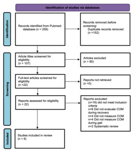 Search of the PubMed database yielded 259 articles. After screening for duplicates this number dropped to 107 records. Title and abstract screening yielded 22 articles for full-text review. Author agreement for inclusion/exclusion prior to full-text review and after full-text review was satisfactory. Ultimately, six articles3,4,6,11,14,15 met the inclusion criteria and quality and bias standard and were accepted for inclusion into this systematic review. Analysis was completed on the final six articles (Figure 1). All studies included are cohort studies with a SORT, level 216 and level 4 evidence as noted with the Downs and Black bias assessment.13