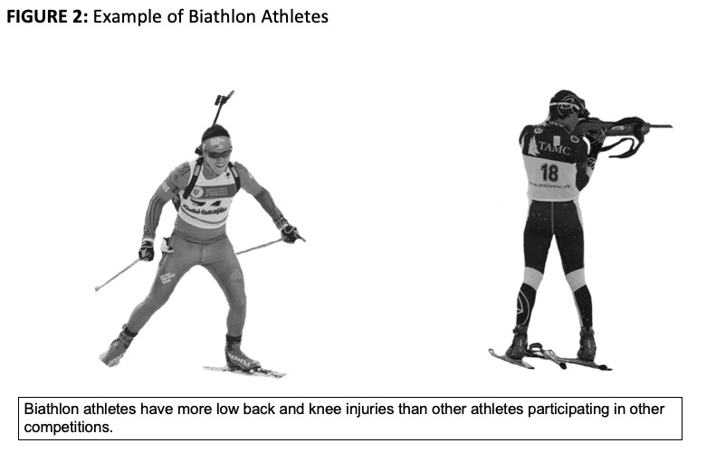 At the 2008-2009 Biathlon World Cup Event, there was a high prevalence of injuries at 40.50%.15 Running was the primary cause of injury with most occurring during training.15 Low back injuries were the most frequent with other common injuries being knee and shoulder injuries.15 There was a higher overall number of injuries in females (39 vs 29), a higher number of lower back injuries (10 vs 4), and a higher number of knee injuries (7 vs 3).15