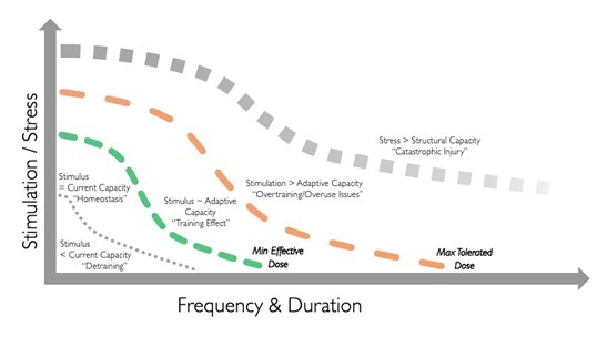 For example, a recent systematic review examining the activity demands during basketball reported guards performed more high-intensity movements throughout the course of a basketball game compared to forwards and centers.15 Although the demands for each sport and individual may be unique, the general energy system demands seen across field and court sports (which also tend to be where most ACL injuries occur) are broadly similar.16 After an ACL injury, these energy systems become detrained secondary to the reduction in stimulus in accordance with the specific adaptation to imposed demands (SAID) principle. This shift in ability can be viewed as the envelope moving “to the left” if viewed within the “envelope of function” model.17 This model, initially proposed by Scott Dye for the musculoskeletal system, contrasts the individual’s physiological capacity with the task demands on an intensity/duration spectrum and has been adapted for this commentary to apply to the cardiopulmonary system, as depicted in Figure 1. The goal of rehabilitation is to shift the envelope of function to the right so that the task demands fall below the maximum tolerated line. Unfortunately, rehabilitation often fails to fully address this shift, resulting in athletes returning to play without the energy system development needed for their sport.18
