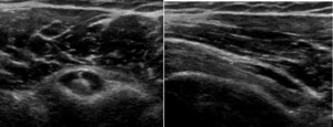 3a: Effusion and edema are seen as an area of hypoechoic signal within the tendon sheath surrounding the LHB tendon. The anechoic ring is known as a “halo sign” on a SAX view. This edema could be either a tenosynovitis or a capsulitis. The LAX will be the differential view.