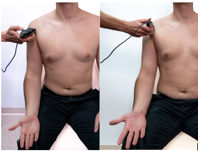 1a: Patient is seated with shoulder and elbow relaxed. Shoulder at 0 degrees of abduction, neutral rotation, elbow flexed and resting on leg or pillow with forearm supinated.